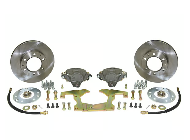 - Includes: Rotors, single piston calipers, caliper brackets, brake hoses, and hardware