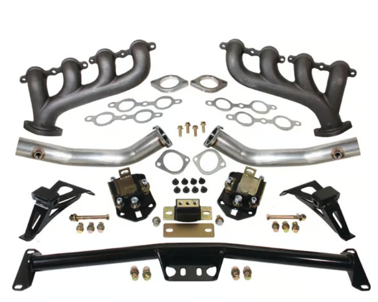 - Includes: engine frame mounts, slier side mount adapters, transmission crossmember, transmission pad, exhaust manifolds, head pipes with O2 bungs, and hadware