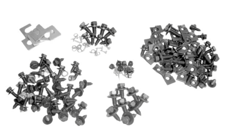 - Includes fasteners for: front fenders, inner fenders, cowl panel, hood latch, latch plate, latch support, radiator support, battery clamp, hood hinges, headlight bezels, fender alignment shims, and radiator support